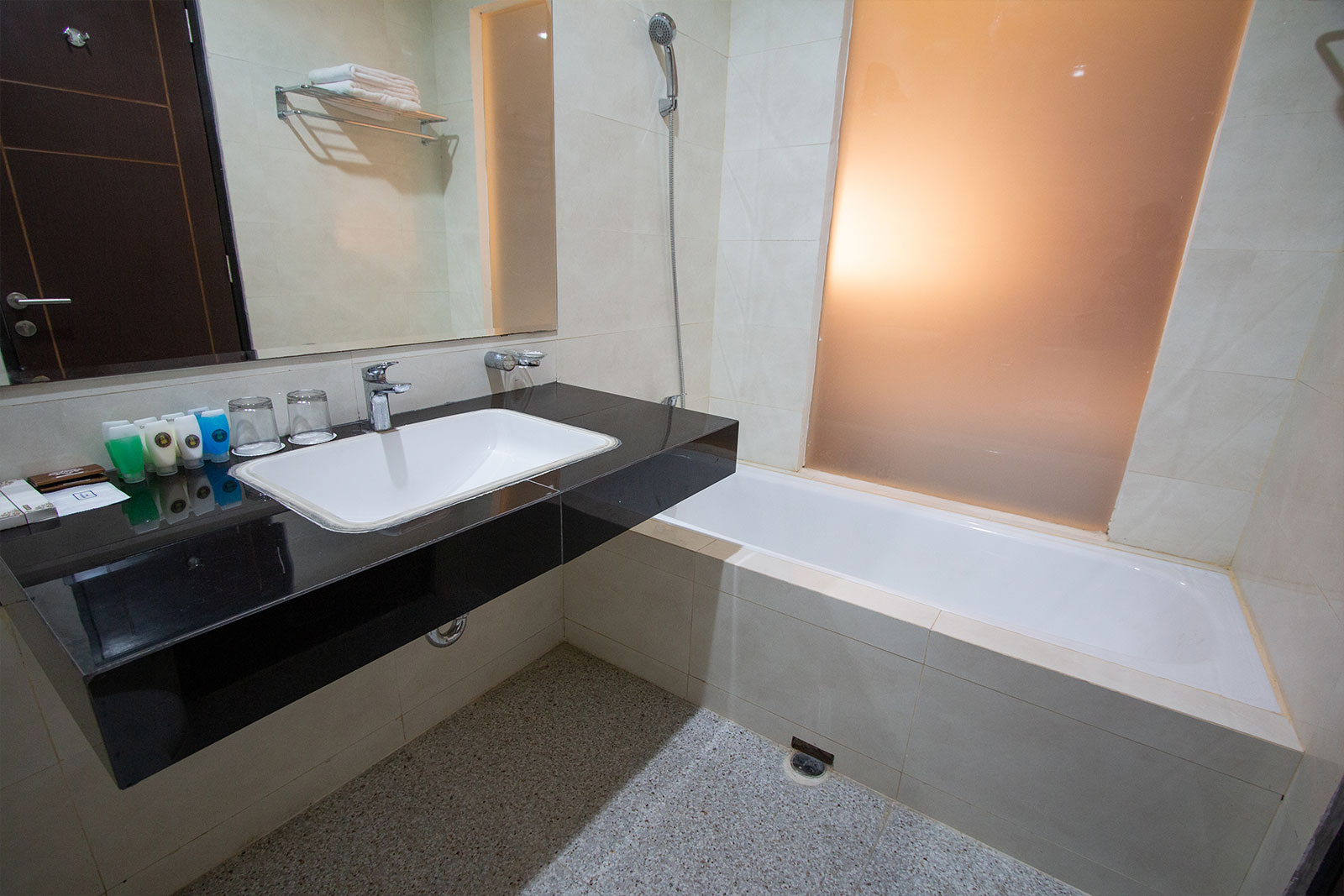 The bathroom is equipped with a bathtub or shower, mirror and sink and toilet bowl. Smoking in room is allowed.